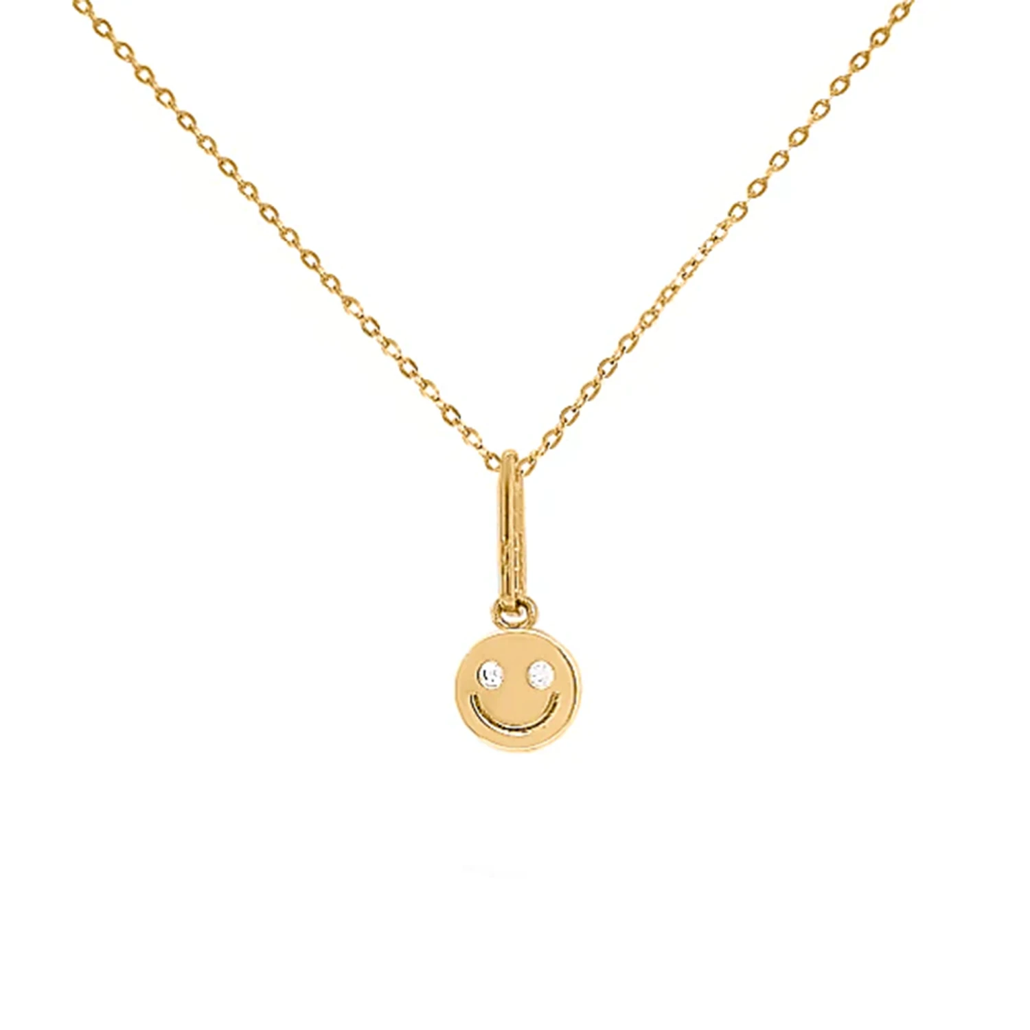 14k gold plated small smiley face charm w. cubic zirconia eyes on 16″ cable chain w. 2″ extender.