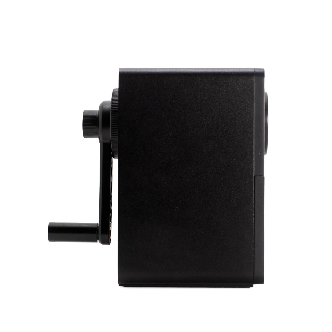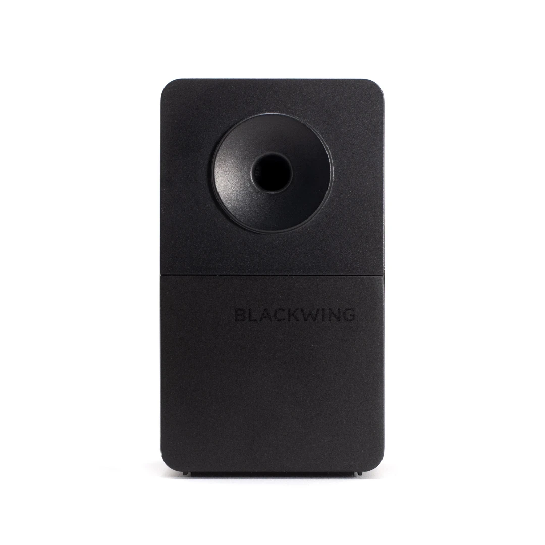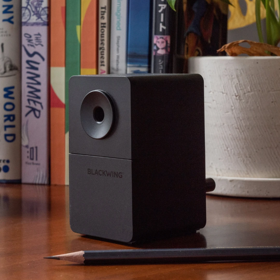 The Blackwing Desktop Sharpener uses a helix blade to sharpen your pencils to perfection. The dial on the crank allows you to adjust the point from long and curved to short and blunt. Its unique sharpening system retracts the pencil automatically without scuffing the finish, and it includes an automatic brake to prevent over-sharpening.