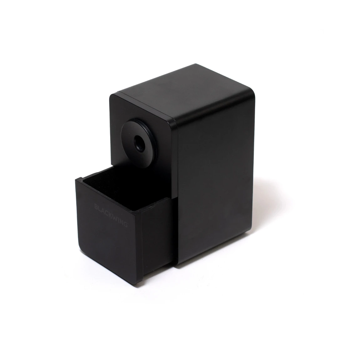The sharpener is cased in a durable matte black metal and polymer shell that looks sleek and feels substantial. It also features a drawer to empty the shavings that locks into place with a satisfying *click*