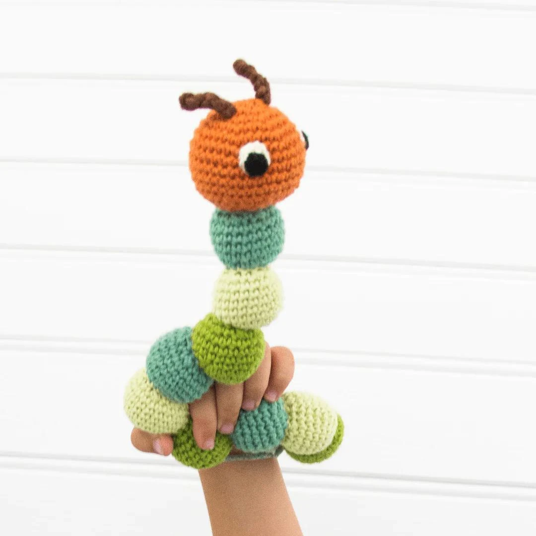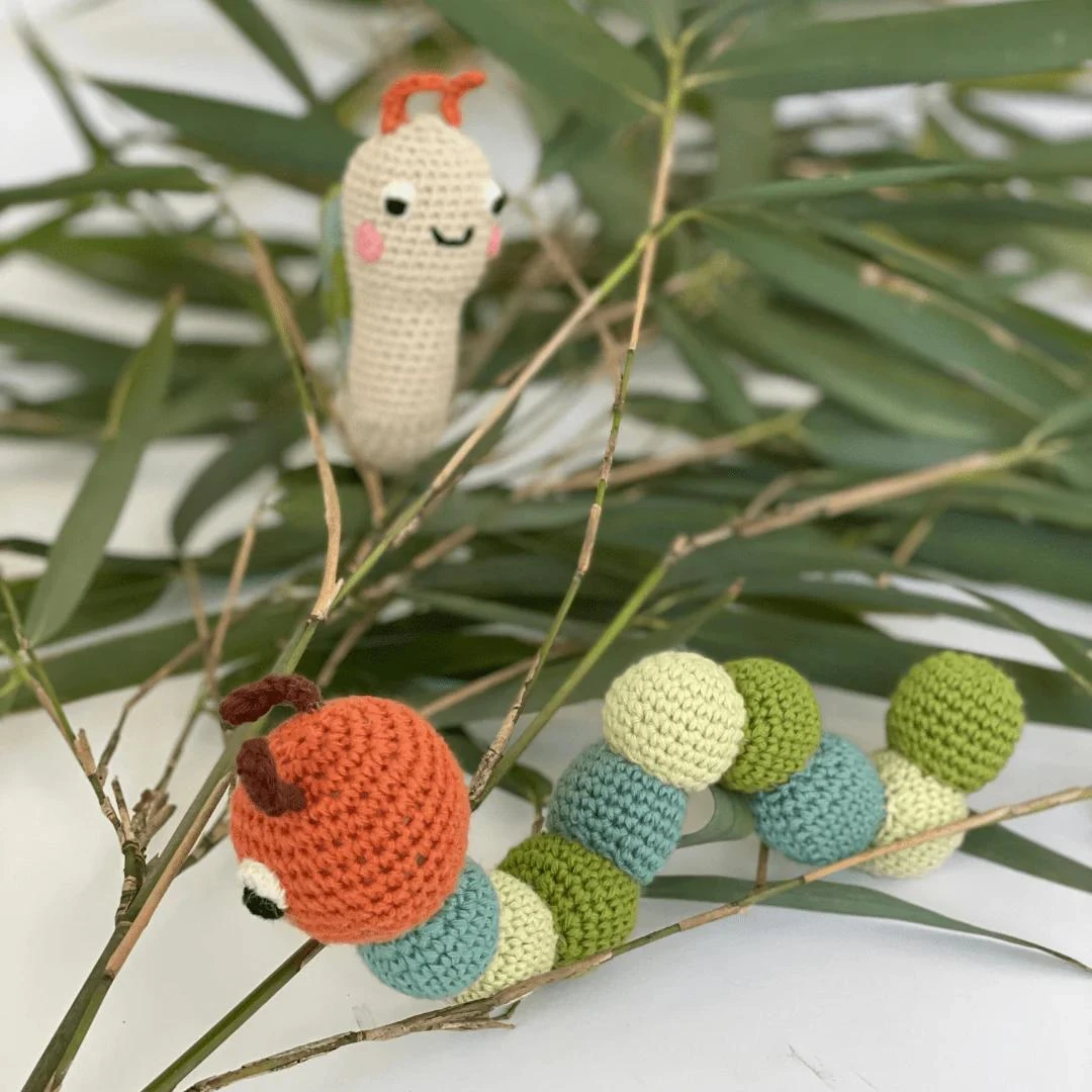 Look who showed up in the garden! This sweet colorful caterpillar! Bla Bla Doll’s crocheted mischievous and gourmand rattles, are made in cotton and easy to grip.