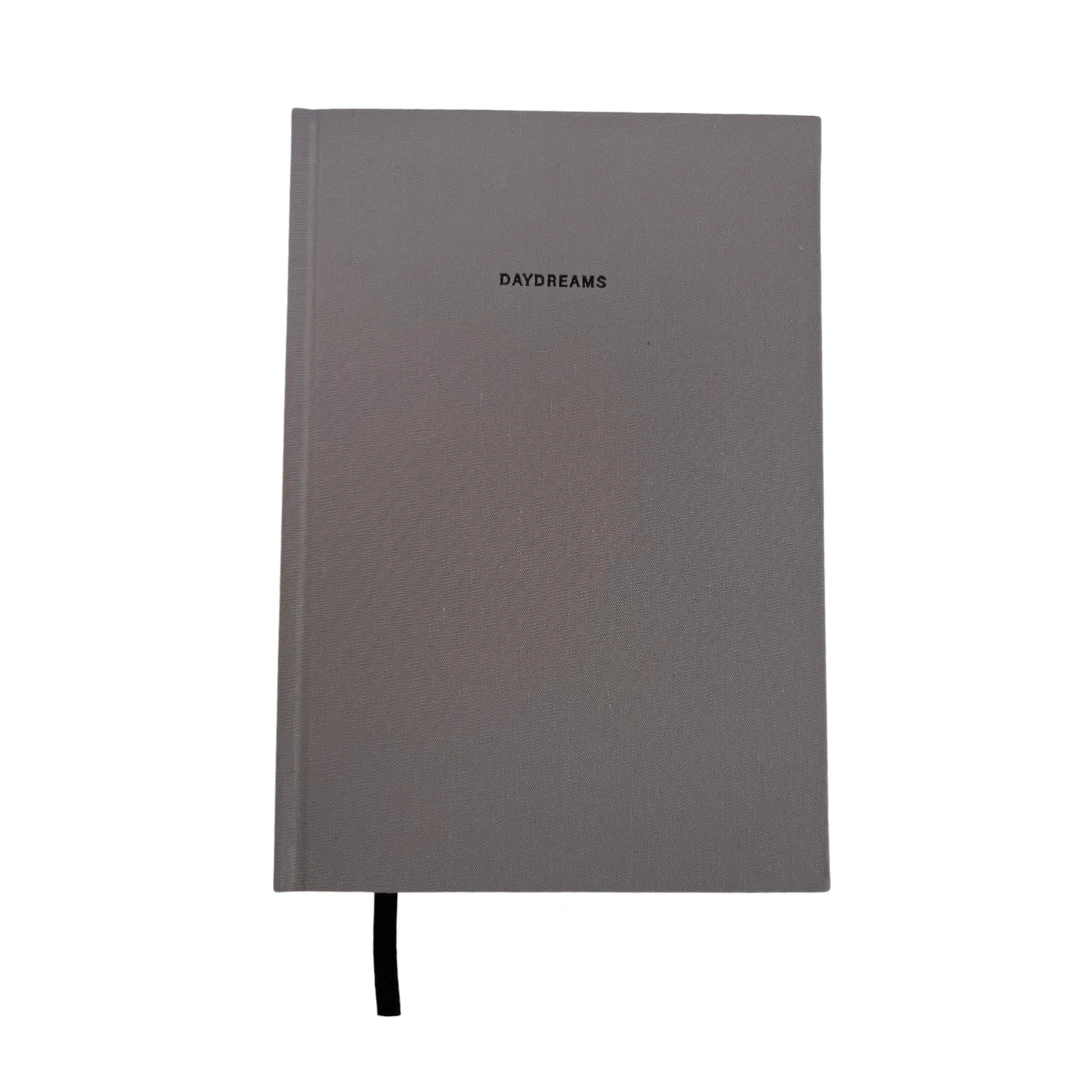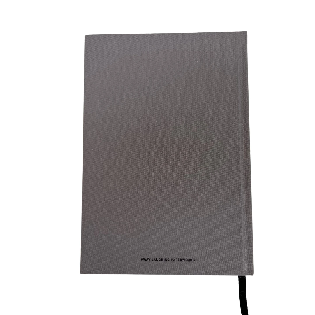 Linen notebook features a minimal expression on the front and spine in gray linen with black foil text.