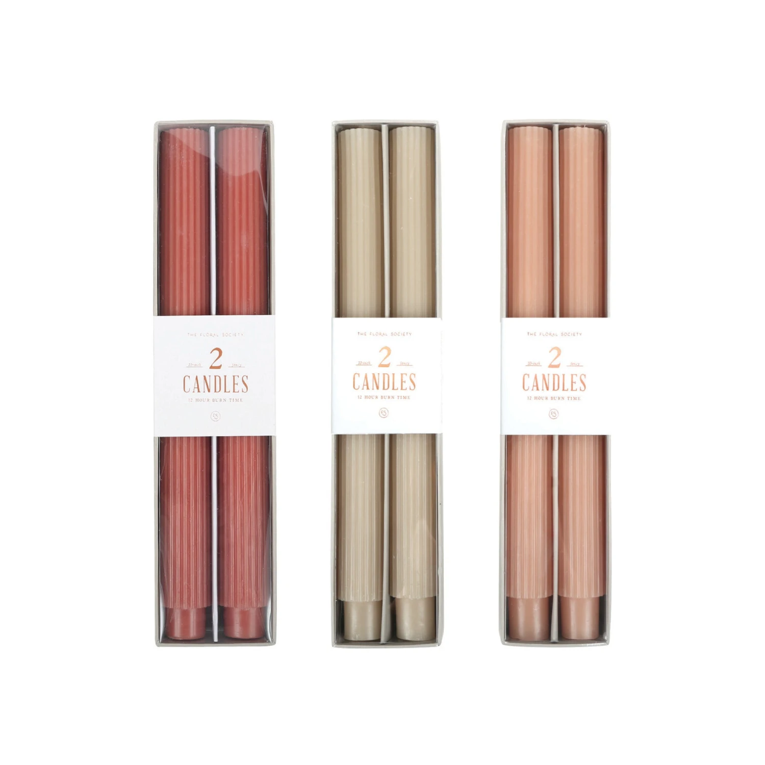 The Floral Society’s Fancy Taper Candles are hand-molded and embody a superior depth of color. A cotton wick is used for the cleanest burn, and the base is sized to fit a standard holder. Each 10” candle is crafted to burn for ten hours. Subtle variations in wax depth and color opacity may occur. Two candles per pack.