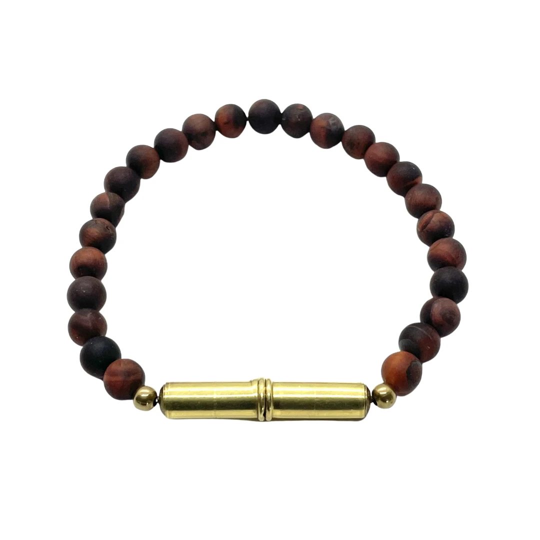 The Flint Beaded Single Bracelet is made using reconditioned .22 shells and strong magnets. This patented closure makes the Single Wrap perfect for stacking. The beaded bracelet is made with semiprecious stones.