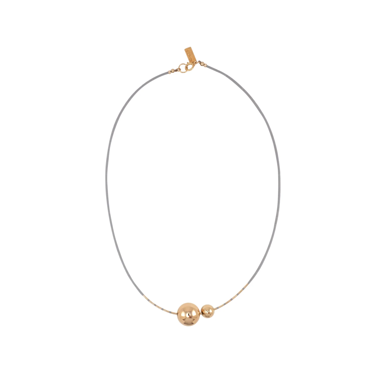 A strand of matte glass beads is symmetrically detailed with gold beads at its center and adorned with a pair of dissimilarly-sized free-moving orbs. Mimas is a fixed design necklace that is designed to pair with other pieces in this collection.