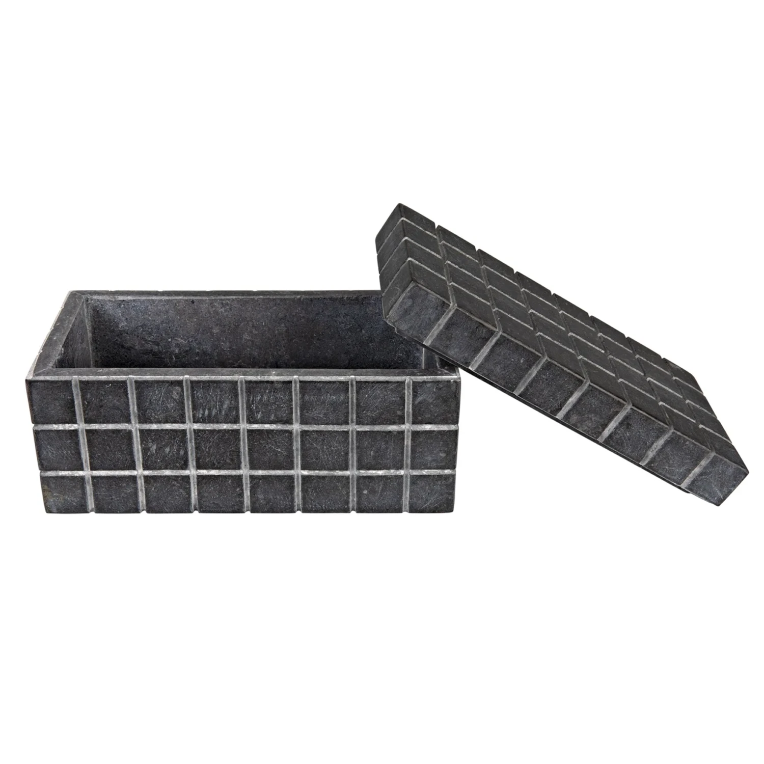 A black marble box is hand etched with a grid pattern on five sides, juxtaposing the beautiful variety of natural stone with a modern pattern. A perfect catch-all for any space.