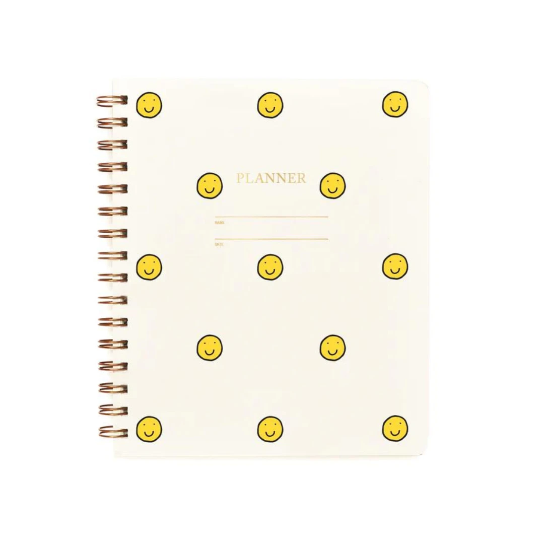This is the happiest planner you could ever find. Just look at it! Jump into each day with a smiley on your face and joy in your heart thanks to the Smiley Face Planner. Rounded corners help prevent bent pages when stuffed into a bag. Planner lays open flat thanks to the beautiful brass wire-o binding. With a letterpressed cover and beautiful interior undated monthly and weekly pages, this planner was designed, printed and assembled by hand in the US. Once you hold this planner you’ll never want anything else!