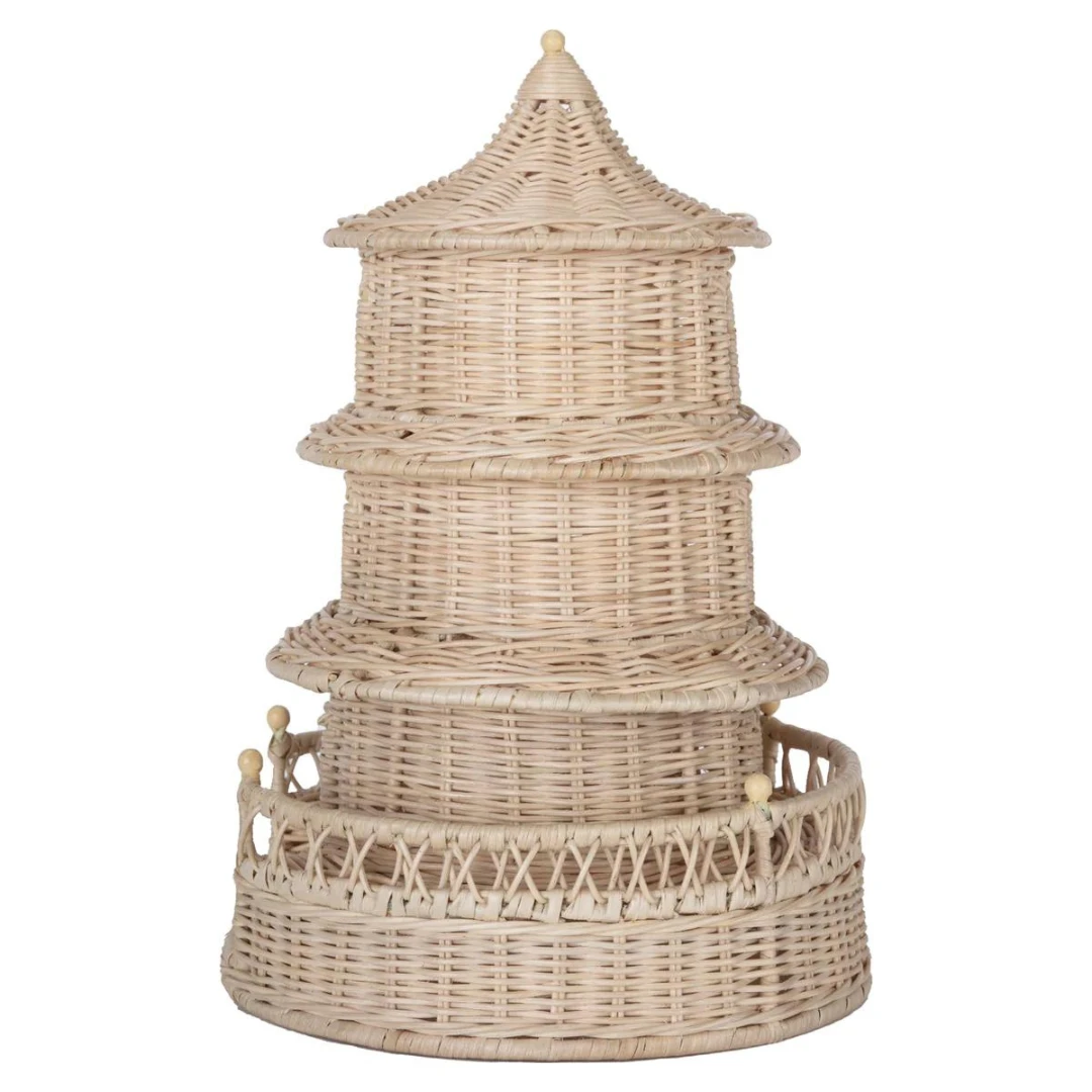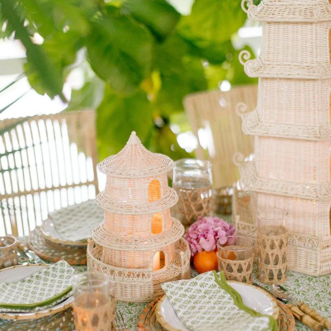 Add a flameless votive underneath to create a magical centerpiece for your dining table or perch atop a console or bookshelf to add a touch of Chinoiserie charm. The classic pagoda silhouette is hand-woven of natural rattan over a powder-coated iron wire frame.