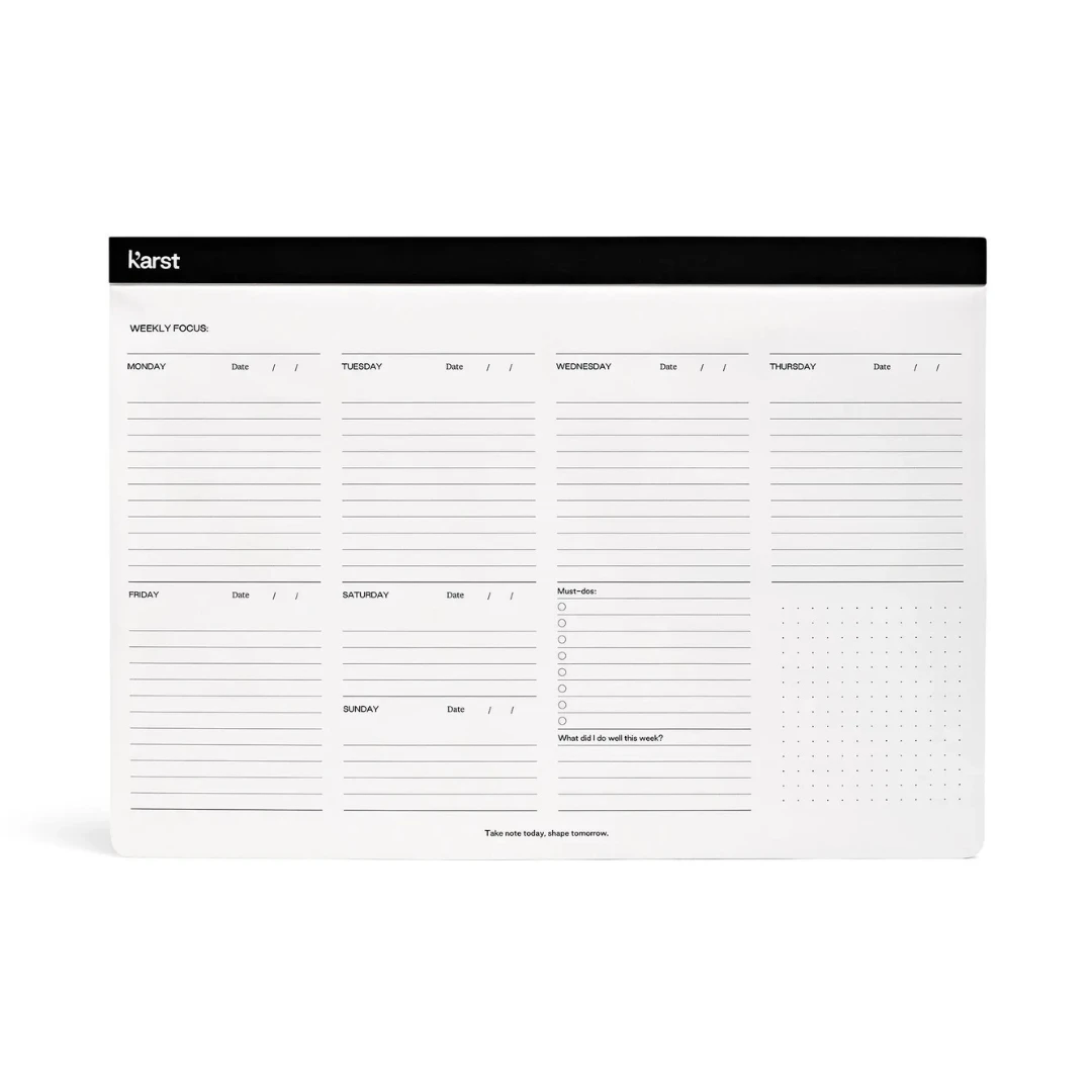The tree-free A4 Weekly Desk Pads are made from high-quality, sustainable, & recyclable stone paper. With a top-flip binding and perforated pages. Karst’s unique, eco-friendly material is acid-free, bright white, and waterproof. Karst’s tree-free Weekly Desk Pad is undated, making it the perfect home for appointments and meetings year-round. With space to track your non-negotiable tasks for the week, a weekly reflection, and a dot grid area for sketches or notes, stay on top of it all with ease. Perfect for everyday use.