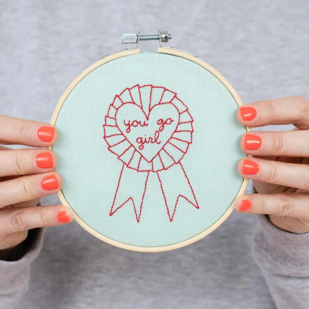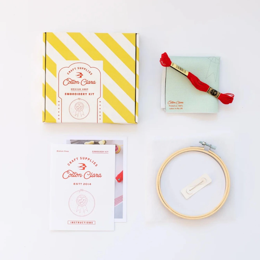 This kit is stitched in a red thread onto a mint fabric. It’s recommended for beginners as it just uses a back stitch.  The design is printed on to the fabric, ready for you to start stitching over it. It’s a bit like drawing with thread.